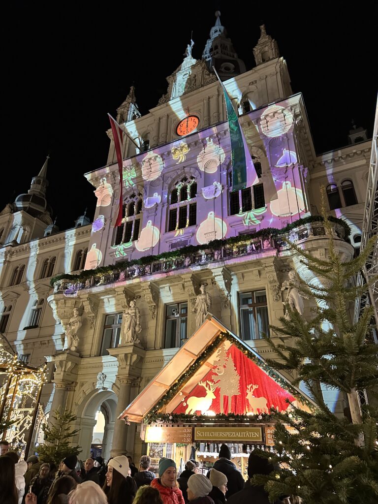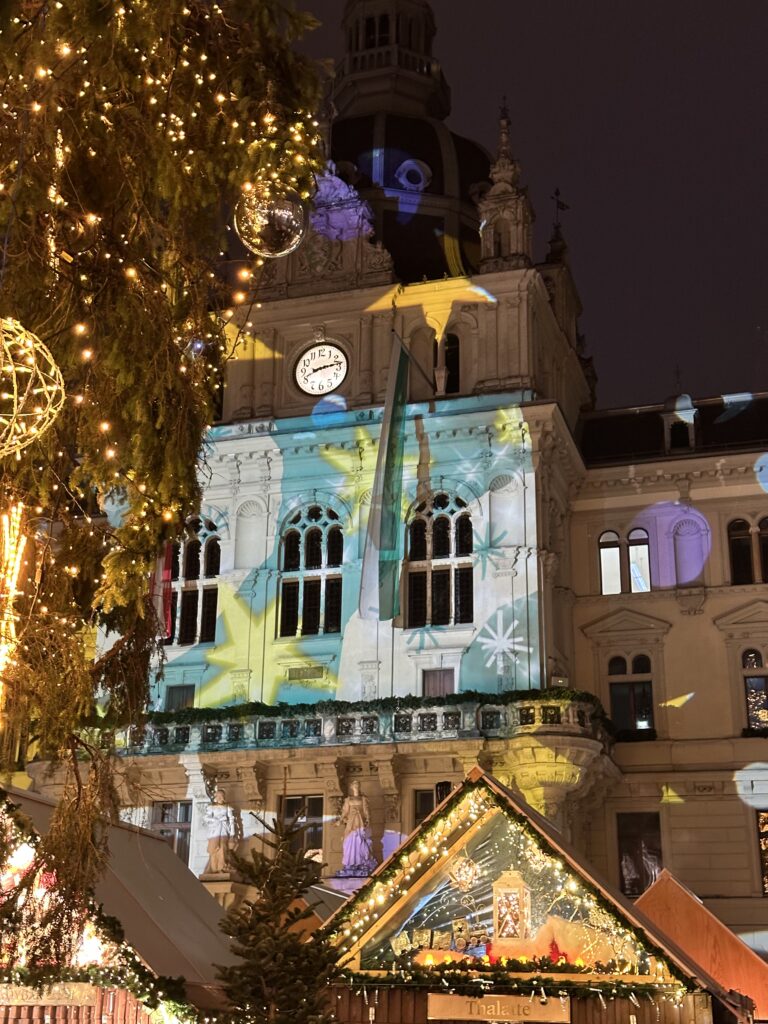 Auch wenn viele Adventmärkte auch als Christkindlmarkt bezeichnet werden, so ist es in Graz doch DER Christkindlmarkt. Er heißt selbst Christkindlmarkt (am Hauptplatz) und ist der größte und bekannteste Grazer Weihnachtsmarkt. Der Christkindlmarkt ist romantisch in die Altstadt eingebettet, direkt unterhalb des Schlossbergs. Um ihn herum stehen hoch die schönen Häuserfassaden um den Hauptplatz auf. Wenn du den Weihnachtsmarkt besuchst, werden dir auch sofort die bunten Lichtspiele an den historischen Fassaden auffallen. Besonders sticht hier natürlich das imposante Rathaus am Kopf des Hauptplatzes heraus. Auf dessen großer Wand kannst du die weihnachtlichen Projektionen besonders gut beobachten.