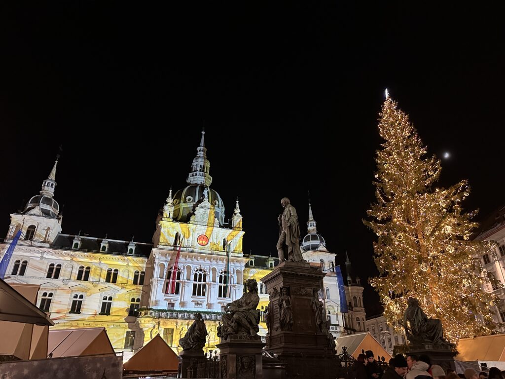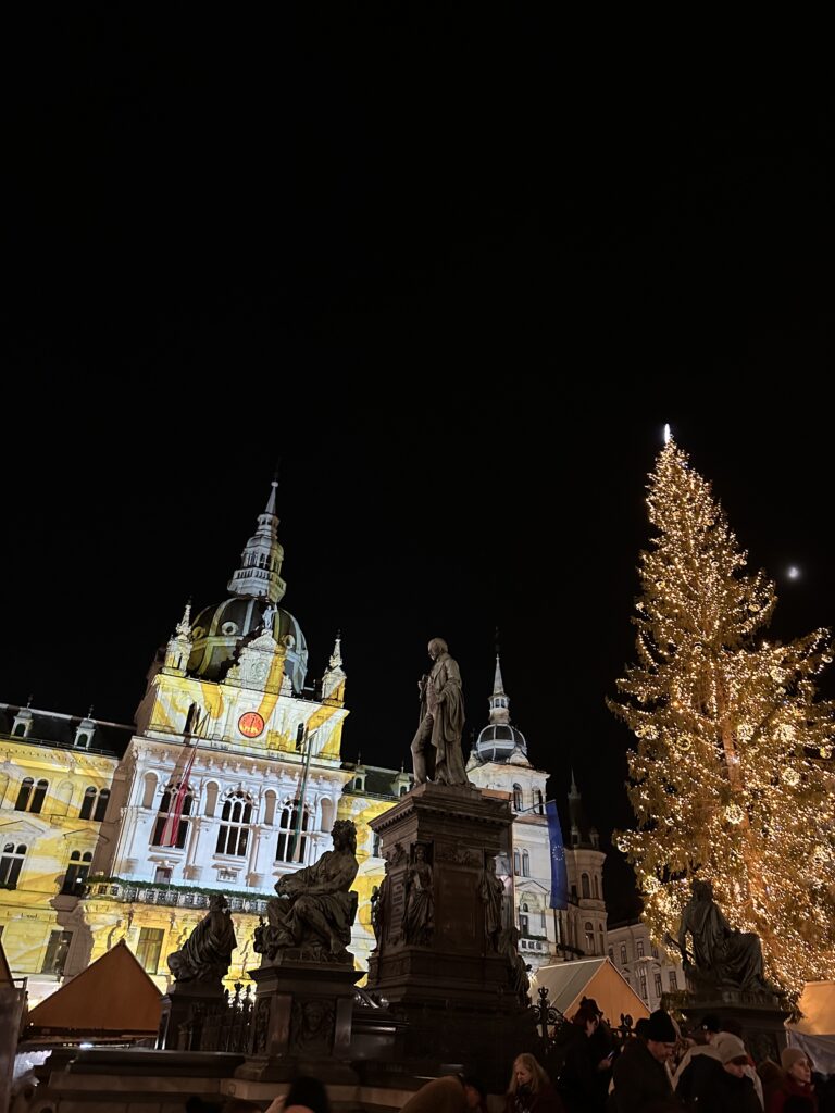 Der Grazer Hauptplatz hat in der Weihnachtszeit einiges zu bieten. Am Christkindlmarkt steht der große, festlich geschmückte Weihnachtsbaum der Stadt Graz. Er ragt hoch über dem Platz auf und strahlt hell über den gesamten Markt. Besonders am Christkindlmarkt ist auch die Beleuchtung der Häuserfassaden rings um den Platz. Die Häuser werden in verschiedenen Farben angestrahlt und es werden unterschiedliche Muster und Motive darauf projeziert. Einige der Projektionen, wie zum Beispiel Schneeflocken am Rathaus bewegen sich dabei auch noch.
