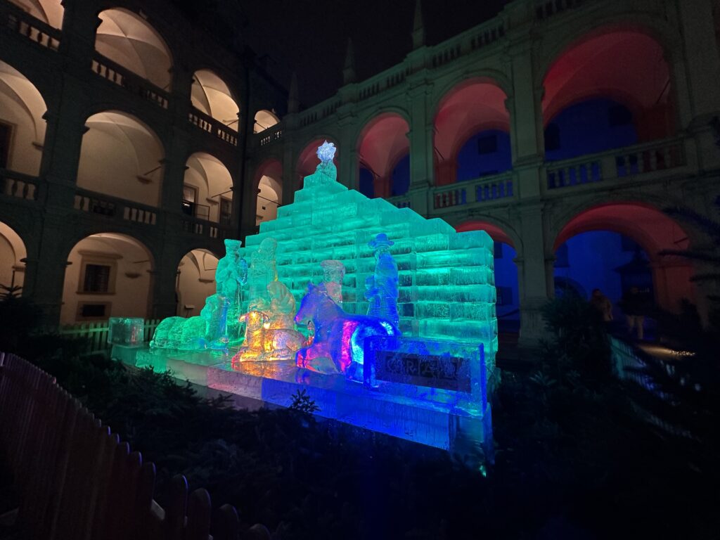Das Besonderste am Christkindlmarkt ist aber wohl die große Eiskrippe. Sie befindet sich im Innenhof des Landzeughauses und ist vollständig aus blankem Eis gefertigt. Das bunte Licht von dem sie angestrahlt wird, lassen die großen Dimensionen noch spektakulärer wirken.