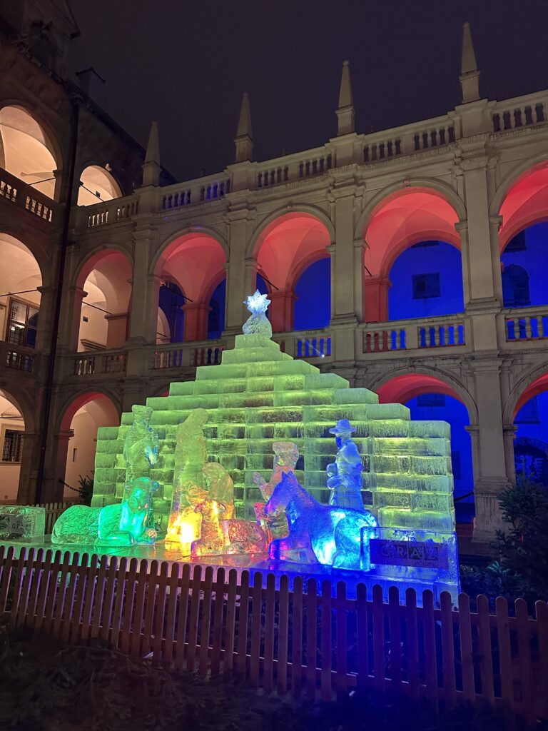 Im Landhaushof steht jedes Jahr im Grazer Advent ein ausergewöhnliches Highlight. Eine vollständige Eiskrippe. Bereits seit 1996 hat diese Tradition Bestand – seitdem wurde jedes Jahr eine einzigartige Krippe aus Eis angefertigt. Auch die Dimensionen der Krippe sind gigantisch. Wenn du dir eine kleine, handliche vorgestellt hast, sind die Abmessungen umso gewaltiger. Ganze 7 Meter misst das Kunstwerk in der Länge und ist dabei knapp 5 Meter hoch. Insgesamt wiegt die Krippe damit etwa 35 Tonnen blankes Eis. Im Landhaushof wird die Krippe auch von bunten Lichtern angestrahlt, was das Kunstwerkt nochmal besonderer aussehen lässt. Geschaffen wurde es übrigens vom Finnen Kimmo Frosti und seinem Team.