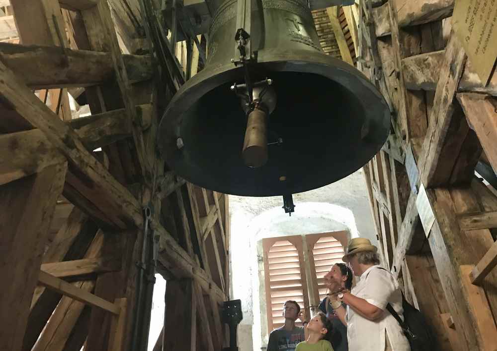Übrigens ist die Glocke Liesl so groß und schwer, dass sie fast zwei Minuten lang schwingen muss, bevor sie zu läuten beginnt. Erst dann hat sie so viel Schwung, dass der Klöppel die Glocke anschlägt und ein Klang entsteht. Früher musste sie noch von Hand geläutet werden. Heute hingegen übernimmt ein Motor diese Arbeit.