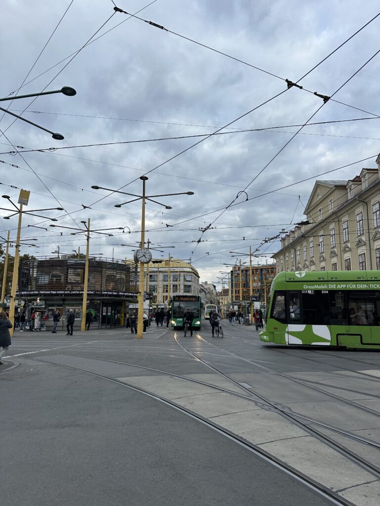 Am Jakominiplatz herrschts stets viel Verkehr – Busse und Straßenbahnen fahren laufend