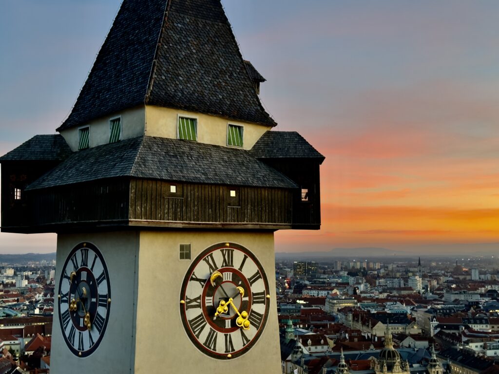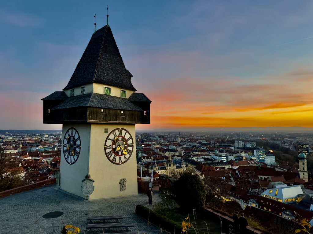 Auf dem Schlossberg in Graz gehört der Besuch am Uhrturm zu den festen Programmpunkten. Als bekanntestes Wahrzeichen der Stadt ist er schon von weitem sichtbar und prägt das Stadtbild maßgeblich. Durch seine Lage hoch über der Stadt hast du einen weiten Blick über die Grazer Altstadt und das umliegende Gebiet. Auffällig am Uhrturm ist das besondere Ziffernblatt mit den vertauschten Zeigern: Der große Zeiger zeigt die Stunden, der kleine die Minuten – eine Seltenheit, die den Uhrturm mitsamt seiner Form unverwechselbar macht.