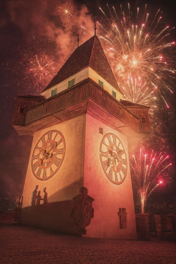 Als exklusivste Adresse für den Jahreswechsel gilt der Grazer Schlossberg. Hier stehen vor allem zwei Dinge im Vordergrund: Gehobene Kulinarik in der Gastronomie hoch über der Stadt, aber vor allem die Aussicht und das einzigartige Rundumpanorama auf Graz. Wenn du mich fragst, gibt es keinen besseren Ort in Graz, um das Jahr zu verabschieden, als den Schlossberg. Du stehst über den Dächern der Stadt und hast das große Lichtermeer unter dir und das volle Panorama um dich herum. In der gesamten Stadt wird die ganze Nacht lang gefeiert und Events aufgeführt. Und klarerweise sind auch die Sehenswürdigkeiten am Schlossberg zu Silvester alle beleuchtet, vorneweg der Grazer Uhrturm.