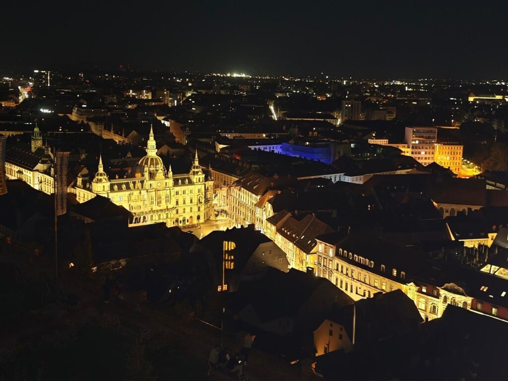 Vom Uhrturm oder der Bürgerbastei am Schlossberg aus siehst du die Lichtshow am Hauptplatz aus der Vogelperspektive – ohne das Gedränge in der Menge. Quasi dein privater Logenplatz. Vom oben vom Schlossberg siehst du perfekt nach unten auf den Grazer Hauptplatz zum Rathaus. Dort findet den ganzen Abend lang immer wieder die Lichtershow statt, die um Mitternacht in ihrem Höhepunkt gipfelt. Wenn du dich nicht am Hauptplatz drängen und trotzdem die Show nicht verpassen willst, bist du am Schlossberg genau richtig. Außerdem siehst du so besser das Licht- und Laserspektakel im Gesamten, anstatt in erster Reihe direkt am Rathaus zu stehen und nichts zu sehen.