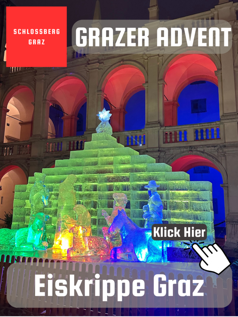 Ein weiteres beosnderes Highlight mit einzigartiger Beleuchtung und Lichtspielen ist die Eiskrippe in Graz. Auch sie wird seit Jahren immer wieder zur Weihnachtszeit in Graz aufgebaut und beeindruckt die Besucher mit ihrer schieren Größe und Mächtigkeit aus blankem Eis. Aber die bunt wechselnden Lichter im Inneren und unter der Eiskrippe sorgen für den ausergewöhnlichen Anblick in den Abendstunden.